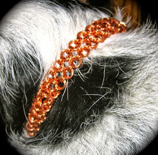 Here's Max sporting his new collar. Solid copper with 2 rows in the byzantine weave and a slightly different pattern on the sides.