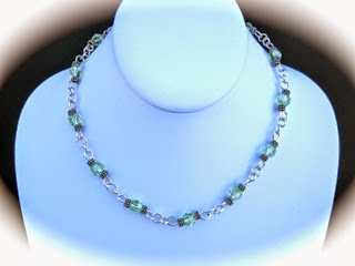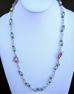 The crystals are 8mm round Swarovski in Erinite color, a pretty light green. The necklace and bracelet can be joined together with the 2 toggle clasps making it 24.5" long or you can wear the necklace by itself (17" long) and the bracelet separately (7.5" long).